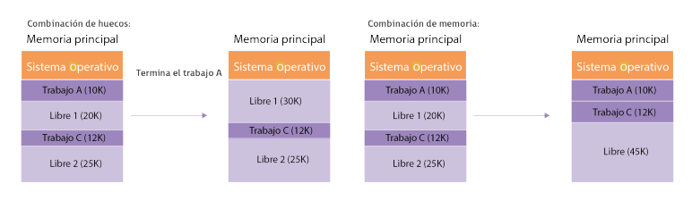 - Cuando un proceso termina, se combina el hueco con el que hay disponible al lado