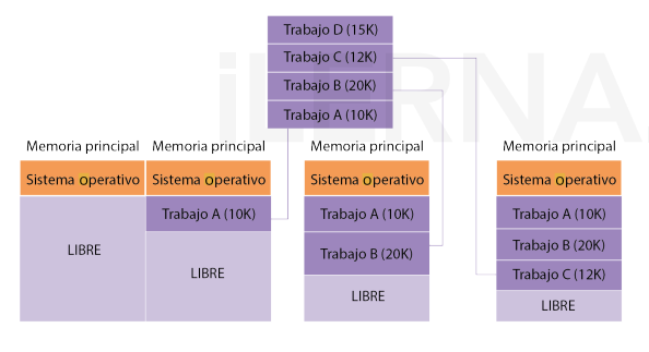 - Cuando un proceso termina, se compactan los espacios ocupados de la memoria, por lo que al principio está toda la memoria ocupada y después toda la memoria libre.